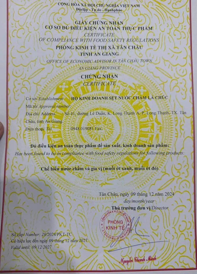 lý và an toàn thực phẩm. Hộ kinh doanh Sệt - nước chấm lá chúc được Phòng Kinh