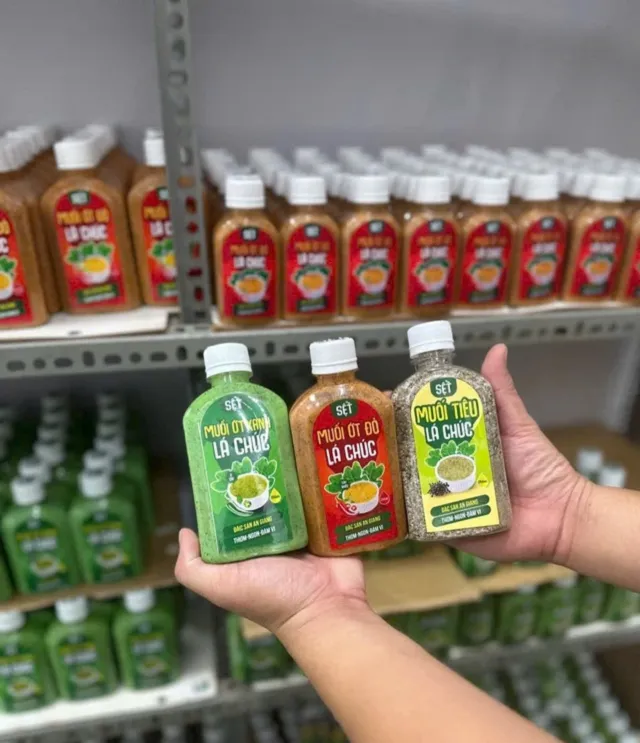 sản phẩm hoàn chỉnh: nước chấm ớt đỏ, nước chấm ớt xanh, muối tiêu lá chúc mang