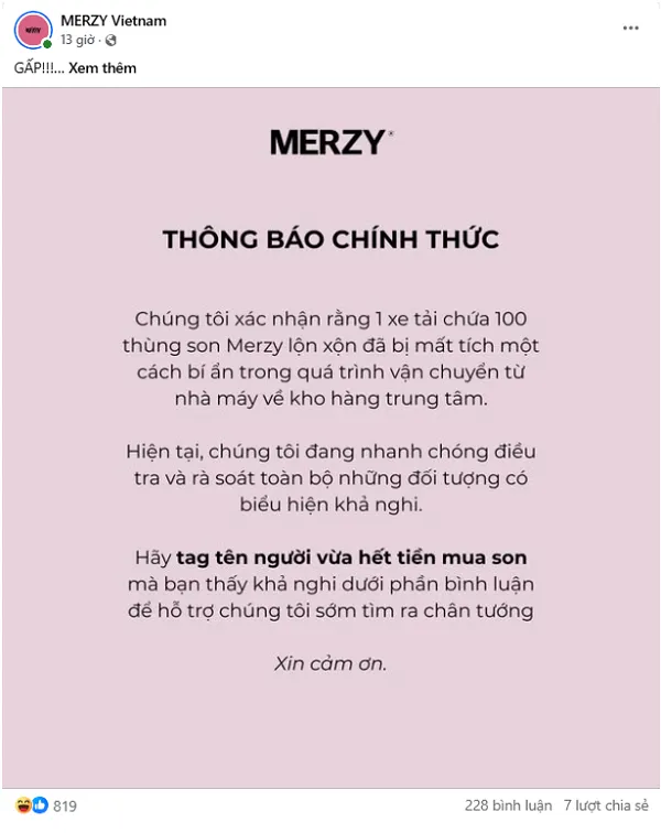 một xe tải chứa 100 thùng son Merzy” và kêu gọi mọi người tag tên người vừa