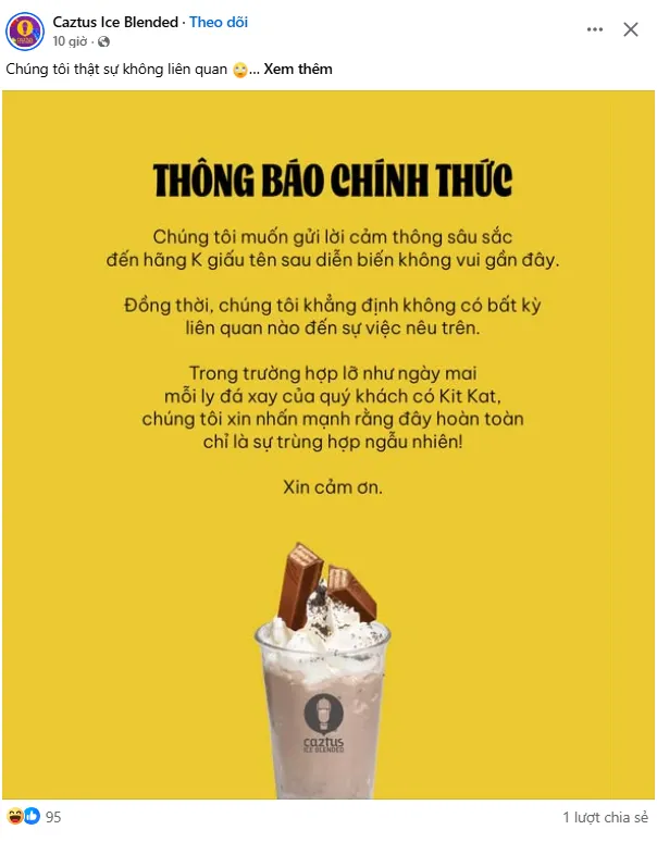 Thông báo chính thức của KitKat trên fanpage Facebook