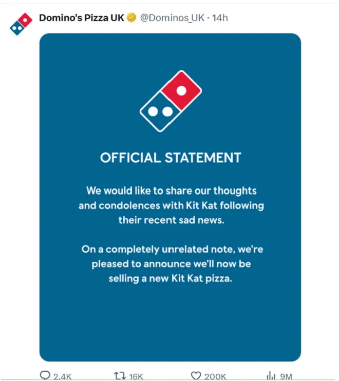 "Chúng tôi muốn chia sẻ suy nghĩ và lời chia buồn với KitKat sau tin buồn gần đây của họ. Về một vấn đề hoàn toàn không liên quan, chúng tôi rất vui mừng thông báo rằng chúng tôi sẽ bắt đầu bán món pizza KitKat mới", bài đăng bắt trend của Domino’s Pizza UK,