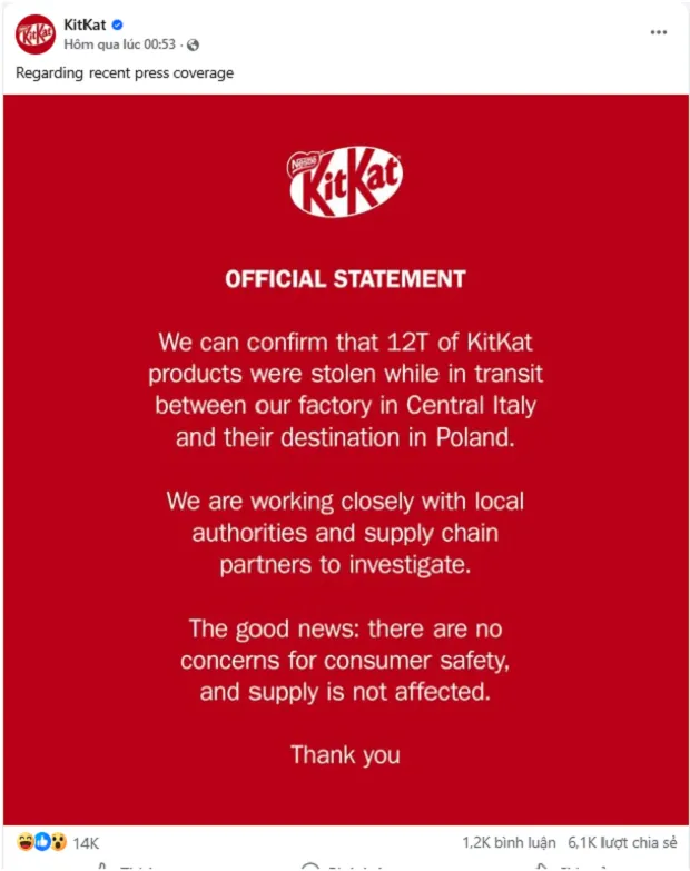 dùng: “Chúng tôi xác nhận rằng 12 tấn sản phẩm KitKat đã bị đánh cắp trong