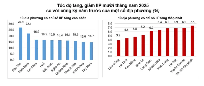 Báo cáo của Cục thống kê cho thấy, chỉ số sản xuất công nghiệp 10 tháng năm 2025 so với cùng kỳ năm trước tăng ở cả 34 địa phương. Một số địa phương có chỉ số IIP đạt mức tăng khá nhờ ngành công nghiệp chế biến, chế tạo; ngành sản xuất và phân phối điện tăng cao .
