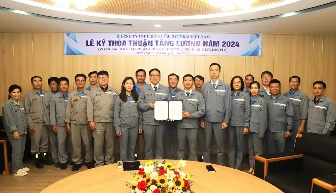 Mới đây, Ban Chấp hành Công đoàn cơ sở và đại diện Công ty TNHH Đóng tàu Hyundai Việt Nam đã ký thỏa thuận tăng lương năm 2024 cho toàn thể người lao động (NLĐ).