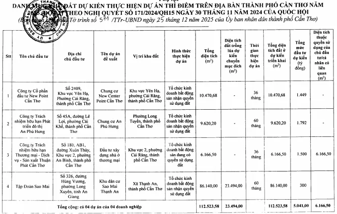 Cụ thể, Cần Thơ dự kiến triển khai thí điểm 4 dự án nhà ở thương mại thông qua thỏa thuận nhận quyền sử dụng đất hoặc đang có quyền sử dụng đất theo Nghị quyết số 171/2024/QH15 của Quốc hội. Tổng diện tích các khu đất thí điểm là hơn 11,2 ha với tổng mức đầu tư dự kiến hơn 5.040 tỷ đồng. Các dự án này tập trung tại quận Cái Răng, quận Bình Thủy và huyện Vĩnh Thạnh cũ.