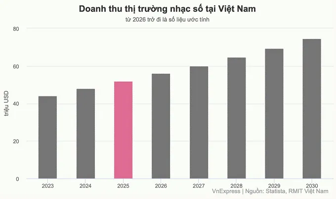 Báo cáo mới đây của Đại học RMIT Việt Nam dẫn số liệu từ Statista (hãng nghiên cứu thị trường toàn cầu) cho thấy, doanh thu thị trường nhạc số trong năm 2025 ước đạt 51,95 triệu USD, tương đương hơn 1.370 tỷ đồng. Con số này tăng gần 9% so với năm 2024.
