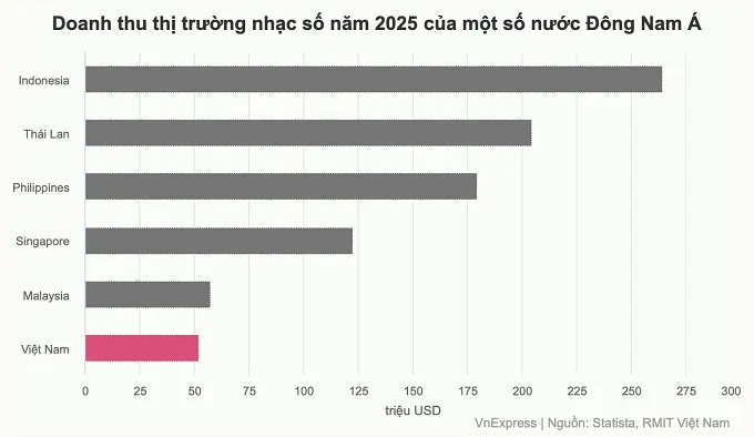 Nhạc số Việt Nam hiện xếp thứ 6 về doanh thu tại Đông Nam Á, xếp sau Indonesia, Thái Lan, Philippines, Singapore và Malaysia. Trong đó, mức doanh thu của Việt Nam duy trì khoảng cách rất xa so với các nước dẫn đầu khi Indonesia đạt gần 264,5 triệu USD, Thái Lan đạt khoảng 204,5 triệu USD.