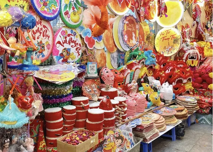Dọc hai bên phố, hàng loạt gian hàng bày bán mặt nạ giấy bồi, trống tùng, đèn ông sao, đèn cá chép… với màu sắc bắt mắt.