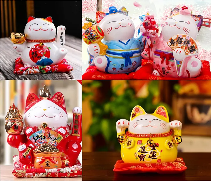 Với tính chất là loại đồ vật đem đến nhiều may mắn, mèo Maneki Neko (Mèo Thần Tài) được thiết kế với nhiều đồ vật đi kèm, màu sắc cũng có sự thay đổi theo từng loại: Mèo hồng mang đến sự may mắn trong con đường tình duyên, Mèo vàng tượng trưng cho sự giàu sang, phú quý ...