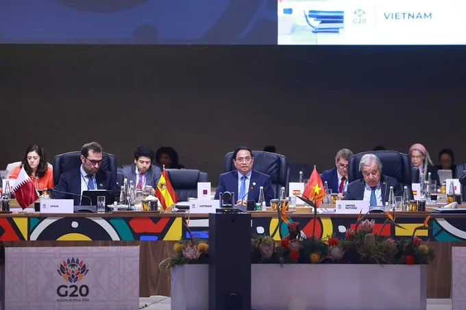 Thủ tướng khẳng định, Việt Nam sẵn sàng hợp tác tích cực, bình đẳng, cùng có lợi với các nước, G20 và cộng đồng quốc tế vì một thế giới hòa bình, văn minh, thịnh vượng, phát triển bền vững và bao trùm, "không để ai bị bỏ lại phía sau"