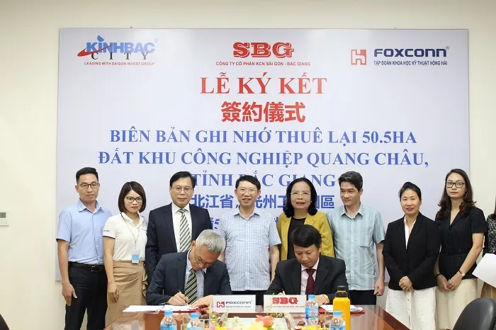 Tập đoàn Foxconn và công ty cổ phần KCN Sài Gòn – Bắc Giang (SBG) thuộc công ty của Tổng công ty Phát triển Đô thị Kinh Bắc (KBC) đã ký biên bản ghi nhớ về việc thuê lại 50.5 ha đất tại KCN Quang Châu…