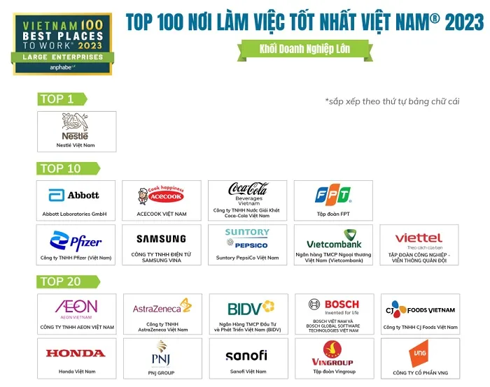 Bảng xếp hạng "Nơi làm việc tốt nhất Việt Nam" do Anphabe tổ chức, Liên đoàn Thương mại và Công nghiệp Việt Nam (VCCI) bảo trợ mới đây đã được công bố.