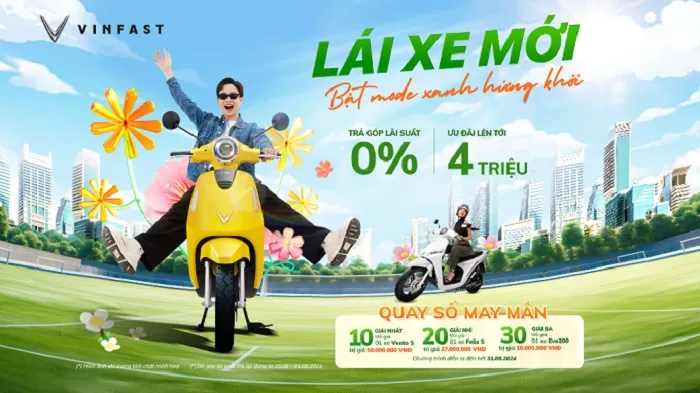 VinFast vừa công bố triển khai chương trình “Lái xe mới - Bật mode Xanh hứng khởi” với nhiều ưu đãi đặc biệt như tặng ngay từ 2-4 triệu đồng/xe, trả góp lãi suất 0% trong 6 tháng cùng nhiều phần quà giá trị dành cho khách hàng mua xe máy điện. Chương trình bắt đầu từ 28/6 đến hết ngày 31/08/2024