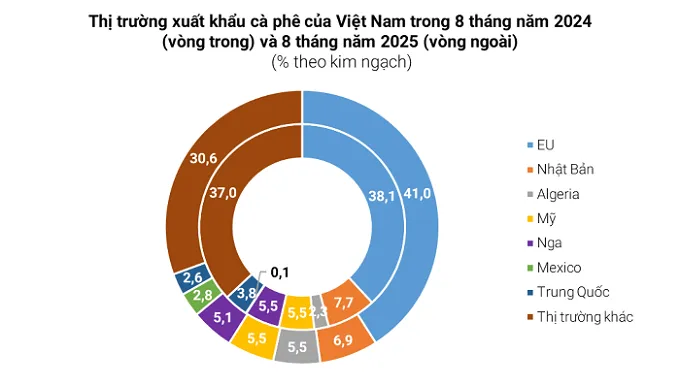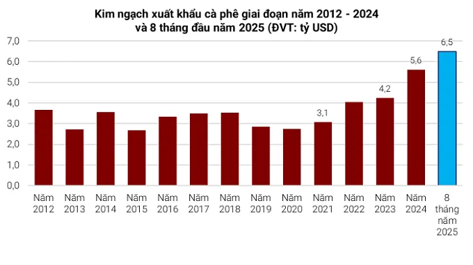 với cùng kỳ năm 2024. Tính riêng tháng 8, giá xuất khẩu bình quân cà phê đạt